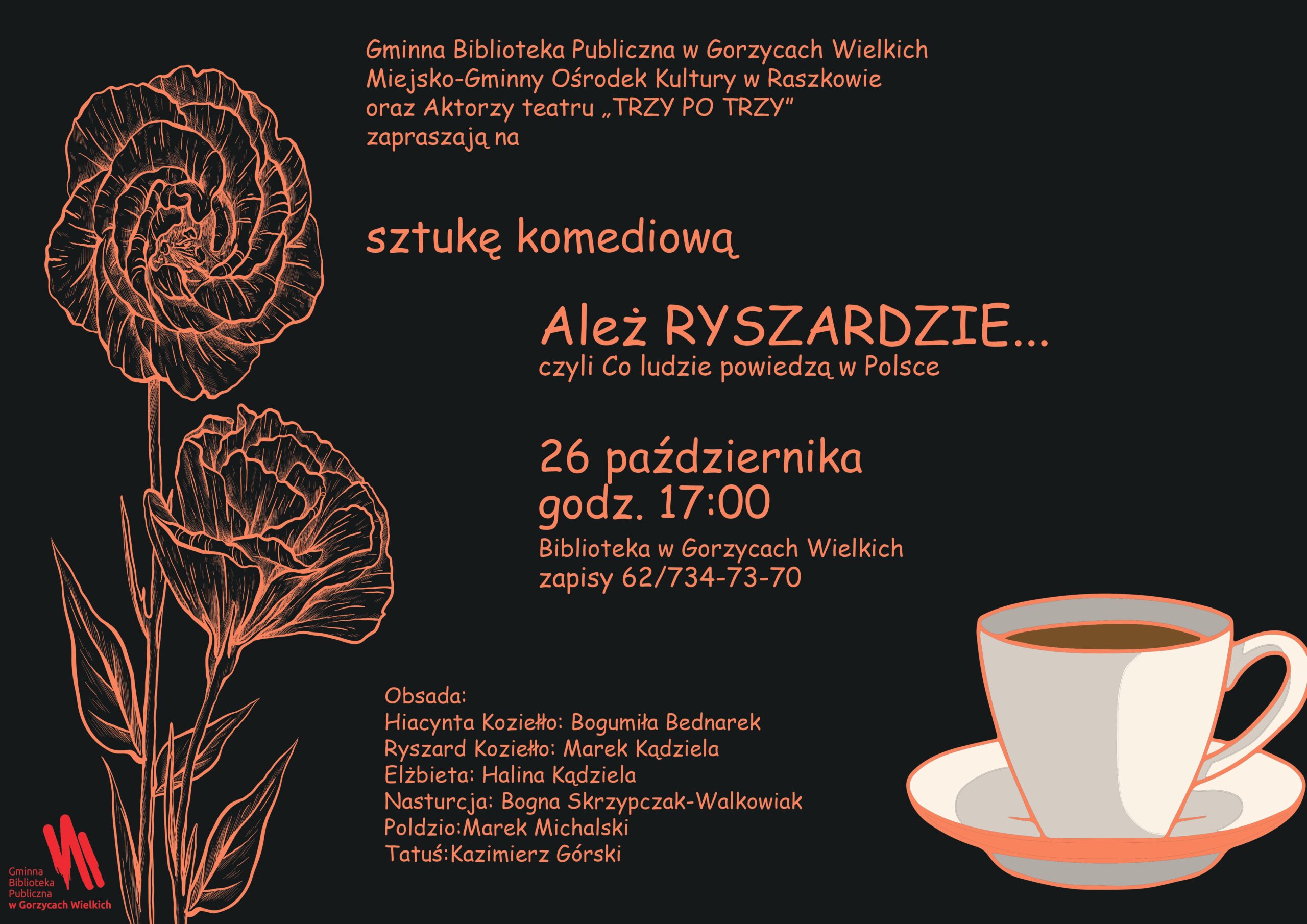 Już 26 października zapraszamy Państwa do naszej biblioteki na sztukę komediową „Ależ Ryszardzie…czyli Co ludzie powiedzą w Polsce”. W rolach głównych aktorzy teatru Trzy po Trzy: Bogumiła Bednarek, Halina Kądziela, Bogna Skrzypczak-Walkowiak, Marek Kądziela, Marek Michalski oraz Kazimierz Górski. Reżyseria: Bogumiła Bednarek, Bogna Skrzypczak-Walkowiak.